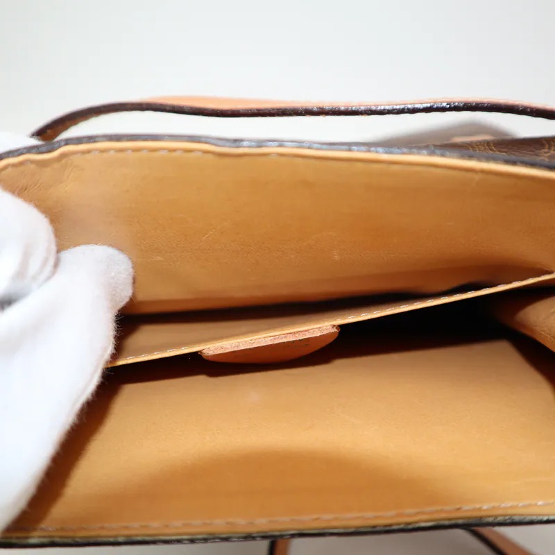 Ranking : B Colour : Brown Size : W21.5 X H21 X D6.5 cm Strap Length : 120-130cm Material : PVC X Leather Remark : Outside leather frayed and creases, bottom edge black mark, metal losing luster, Inside edge frayed, Inside scratches and frayed
